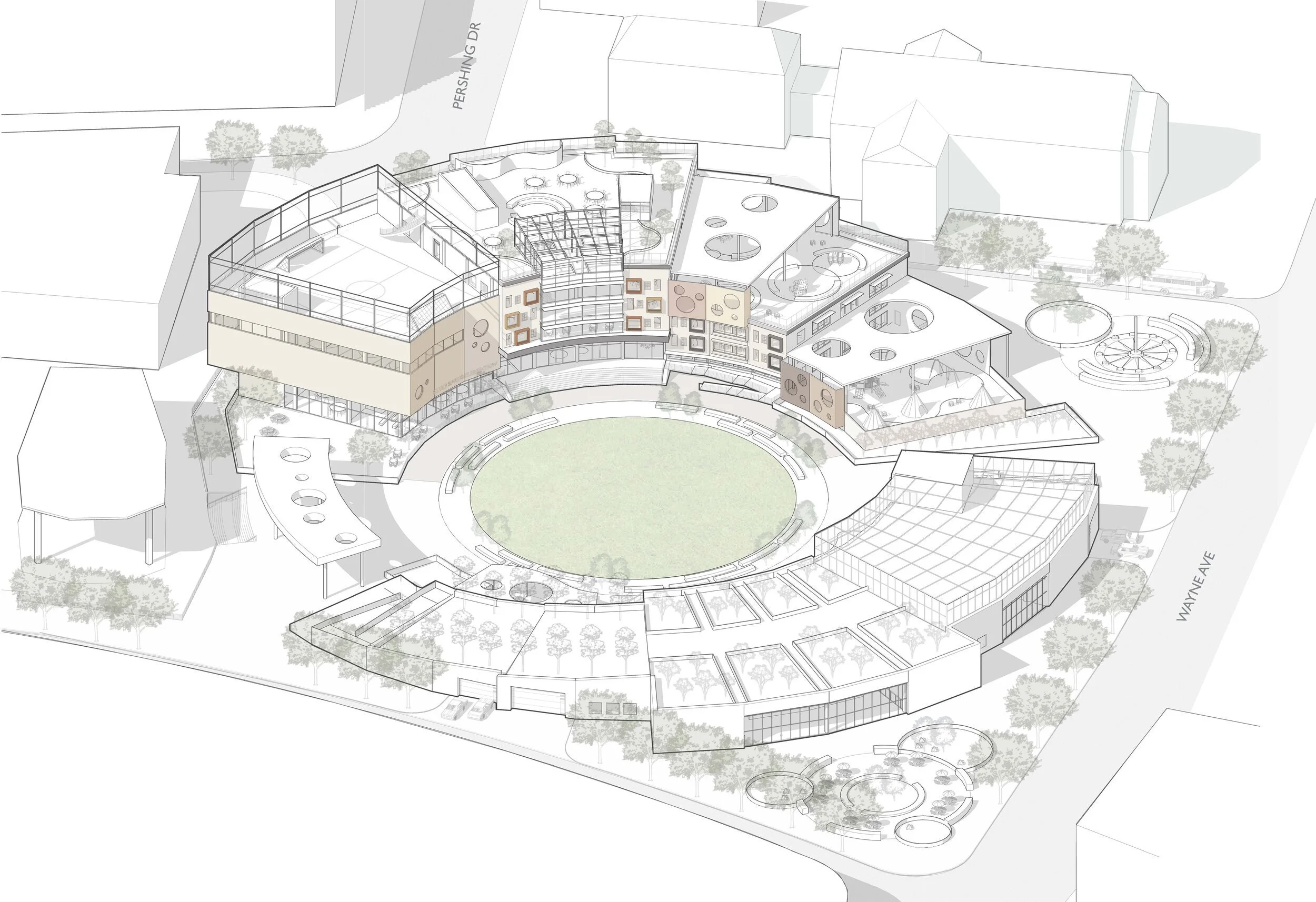 This thesis examines the pragmatic implementation of a concept school design that integrates contemporary views on learning and education. A common problem of schools is social isolation and this isolation occurs at the student, teacher and community levels. In order to mitigate these social isolation problems, a primary school is designed with three aims. First, the location of the school is proposed within an urban and vibrant area in downtown Silver Spring as opposed to schools commonly located in residential neighborhoods. Second, a curved building design is explored to connect schools with local businesses and to further develop shared spaces that can be used by students and the community. Third, the interior layout attempts to enhance experiential learning, social interactions and community integration. Through its architectural design, the Concept School, pursues to mitigate social isolation to design a school that creates lasting connections between children, teachers and the community.